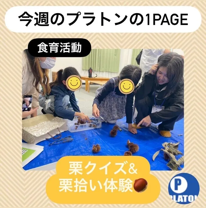 先日の食育活動の様子です。栗クイズではなぜ栗にはトゲがあるか、栗の可食部分は何に当たるかなと、栗について深く知ってもらう時間を設けました。知識を得てから、本物の栗で栗拾い体験を行うことで、より興味を持ちながら取り組むことができていたかなと思います◎今後も、食への興味関心を高められるような活動を提供できたらと考えております💡