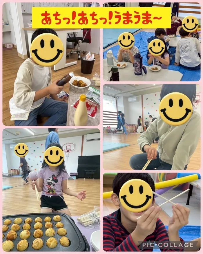 たこ焼きクッキングはなれたもの♬「僕ひっくりかえす!」「青のりどこ?」「何個食べていい?」とわいわいお友達。
