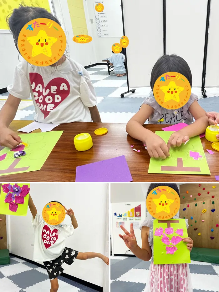 微細運動を行うため、折り紙をちぎっていき丸の中に糊をつけて貼るといったことをしました!!