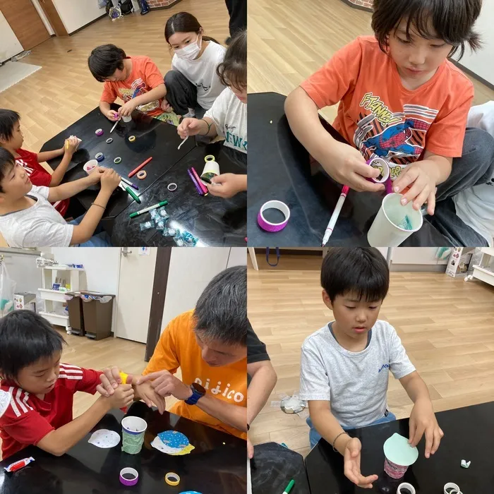 紙コップのフタからボンドが垂れないよう、量や力加減を考えること。