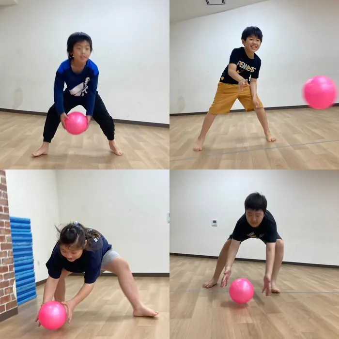 床に貼られた横まっすぐな線の上で、スタッフが転がすボールをサイドステップで取ってもらう活動です💪