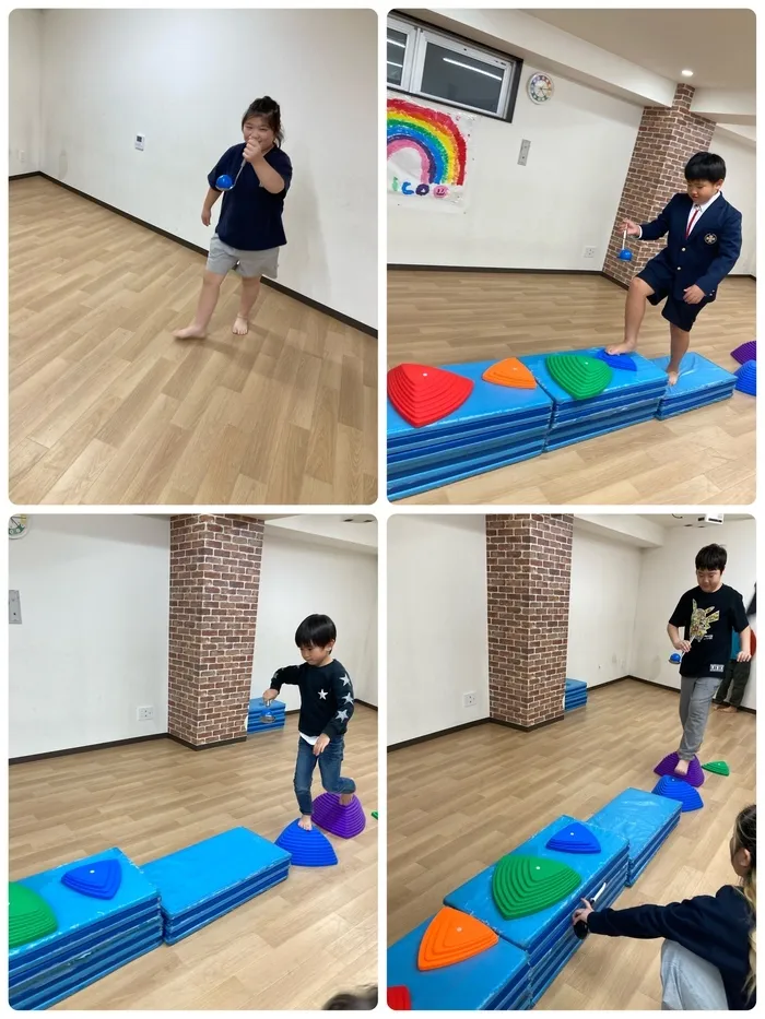 おたまにカラーボールを乗せて、落とさないように進みます☝️