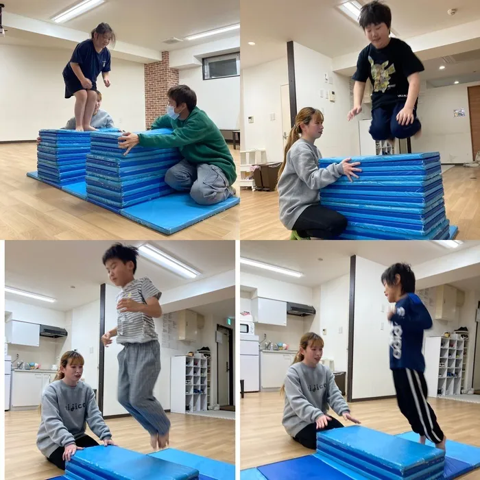 まずは一段と低いマットからジャンプをしてもらい、徐々にマットの数を増やしています✨