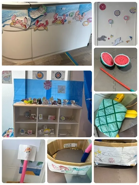 画像は、プレールームでの活動の物ですが、個室でも夏祭り間違い探し、迷路、言葉探しなどなど夏祭りにちなんだ課題を沢山行いました。焼きそば、フランクフルト、かき氷、金魚すくいなど、活動の中で制作したもので、お父さん、お母さん、全職員に自分で声をかけるところから、縁日屋さんごっこもしました。