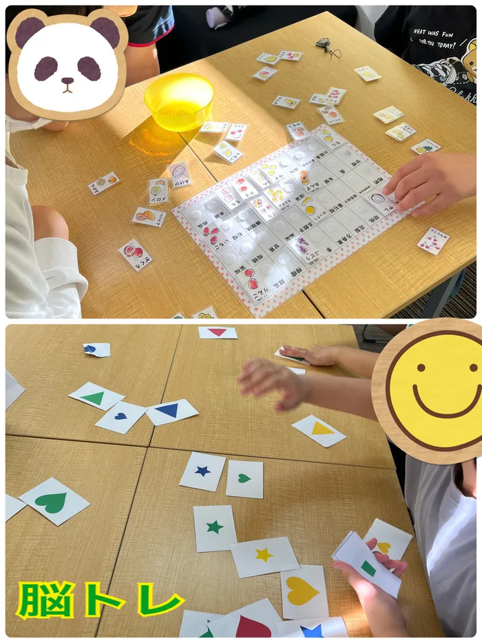 「黄色い大きい三角」「赤いマフラーを巻いた猫」など色や形などヒントをもとに素早く判断してカルタを取りました。