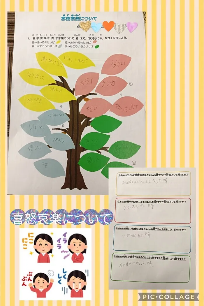 グループワークで行い「喜怒哀楽」を別の言葉で言い表すとどんな言葉で表現できるのか気持ちの木を作り、どんな時に喜怒哀楽を感じるのかについてもお友達と考えました。