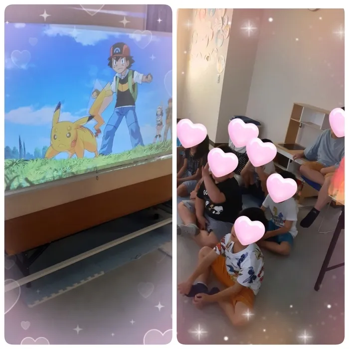 はぴねすのお部屋を暗くしてプロジェクターを使って、上映しました。