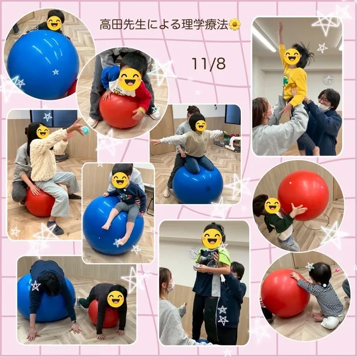 最初は少し怖がっていたお友達もコロコロと転がしたり、職員と一緒に乗ることで楽しんで取り組むことができました😊✨