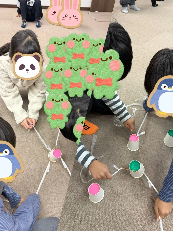 ・輪ゴムを操作してコップを運ぶ活動を通して、協調性やコミュニケーション能力を養う。