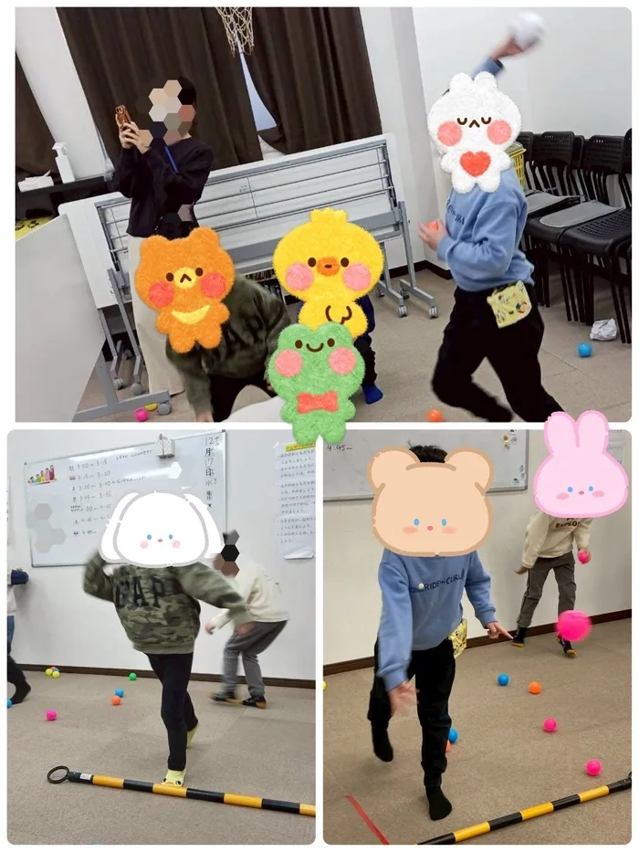 ・雪に見立てた新聞紙やカラーボールを、相手の陣地に投げ入れることによってコントロール力を高める。