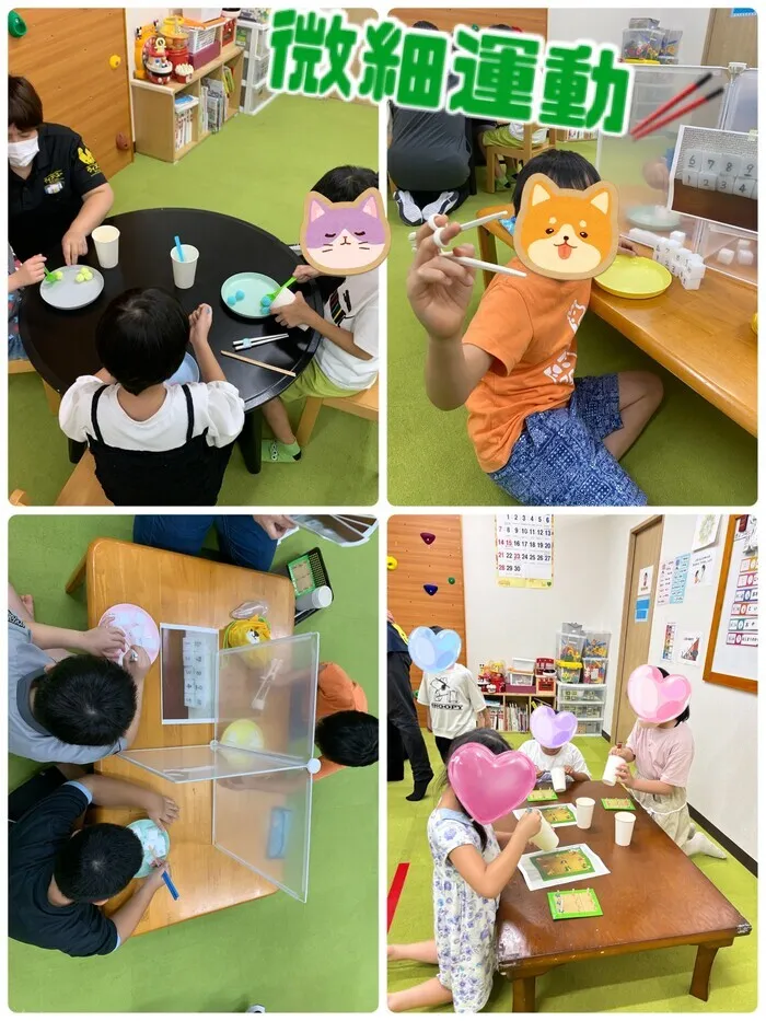 次に箸、トング練習では、フェルトポンポン18個をトングや箸を使って写真と同じ大きさ・色を合わせて置いていきました❣