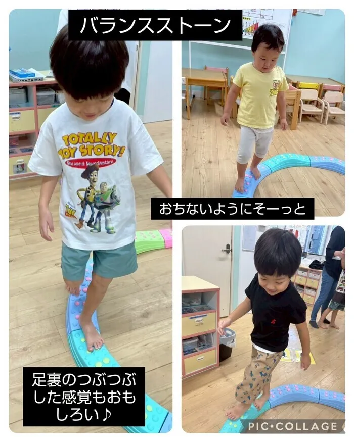 体の傾きを視覚、触覚、固有覚(関節の動きを感知)、前庭覚(体の傾きを感知)から感じ取り、どのように動いたら落ちずに渡れるかな…と繰り返し遊ぶことで学習しています♪