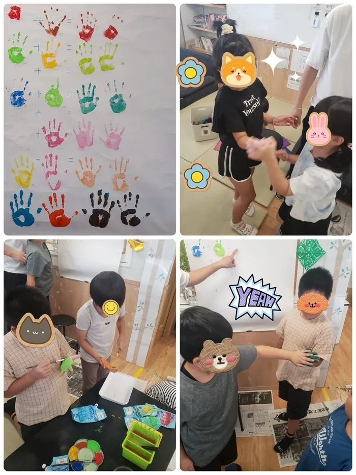 絵の具を塗って、お友達同士で手と手を合わせてみると新たな色が出来上がり!