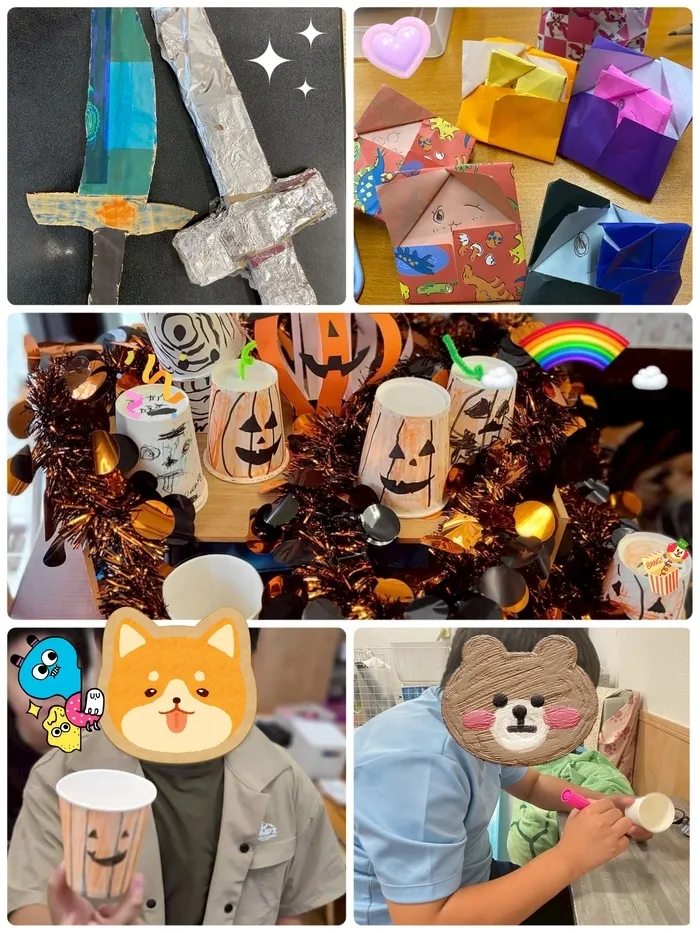 さて、先日のブログでも徐々にハロウィンらしくなってきた教室風景を紹介させてもらいましたが今週になりさらにハロウィン色が強くなってきています😊紙コップでジャック・オー・ランタンを作ってみました♪また、ハロウィンの工作以外でも折り紙でひたすら猫や無限くるくるを折ったり、廃材(段ボールやアルミホイル)を使って剣を作る子も✂️