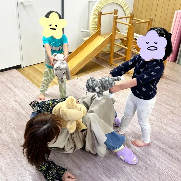 お気に入りのぬいぐるみを手にたたかいごっこがスタート!