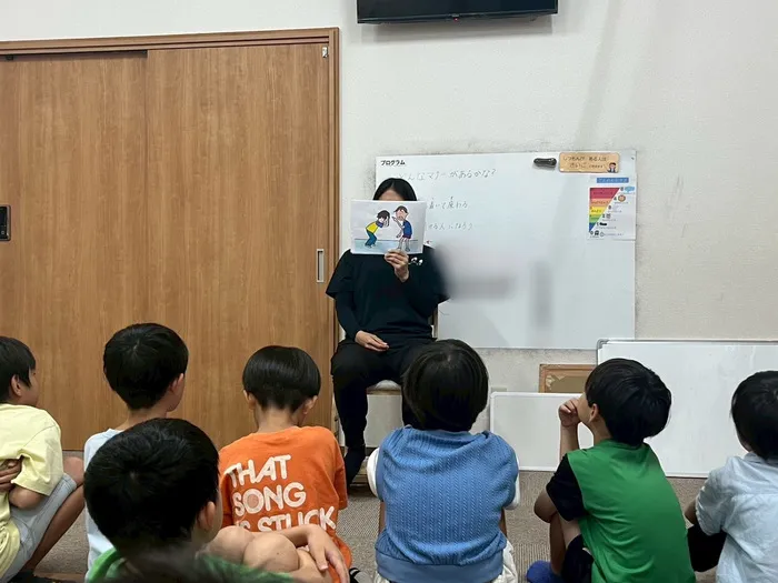 私たちが普段生活する中で大切なマナーやルールについて、先生が紙芝居で分かりやすく教えてくれました!