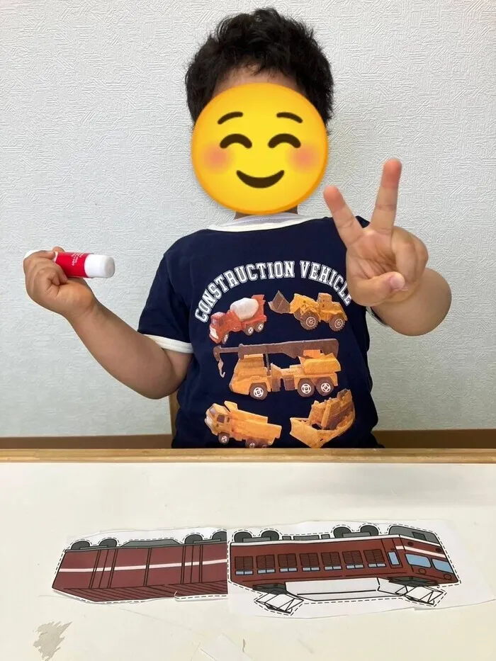 この写真では、枠に合わせて電車のイラストをのりで貼っています。