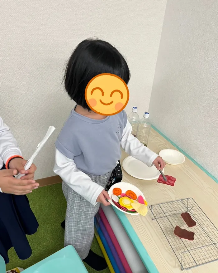 写真の中では、三人のお友達で焼肉屋さんごっこをして遊んでおり、子どもたち同士で「いらっしゃいませ!焼肉いかがですか?」「じゃあお皿取って一枚どうぞ!」「ありがとう!おいしかったよ!」など、たくさん会話がうまれてきます。