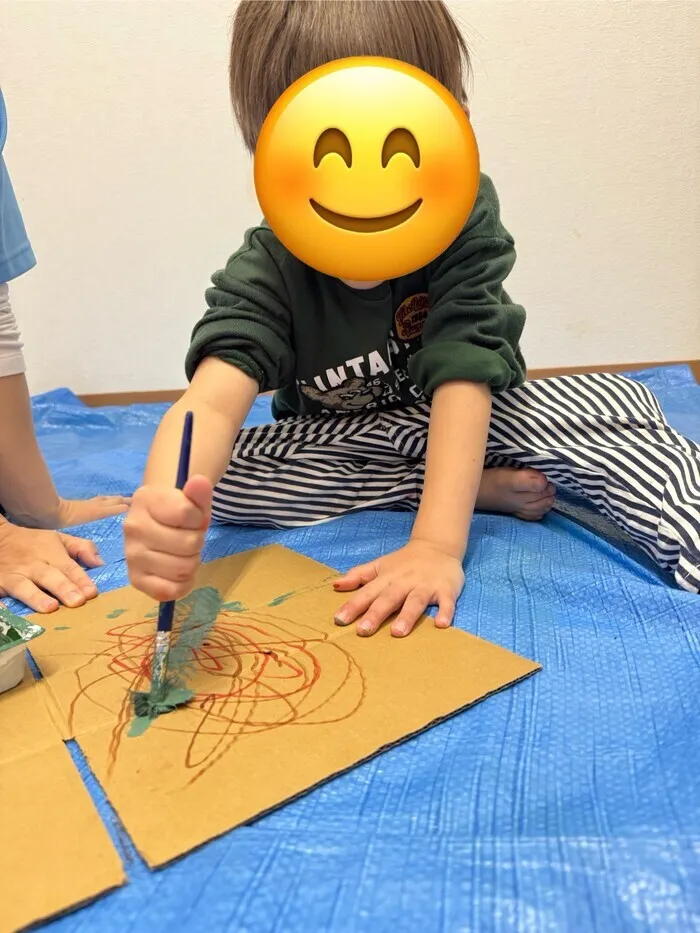 普段は机に向かって紙にお絵描きをすることが多いのですが、この日は床にシートを敷いて、ダンボールにお絵描きをしました!