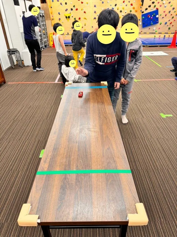 一つ目は、机の上を車のおもちゃをスライドさせて、スタート位置からゴール位置まで、ピッタリ停めることができるのか!? という内容です。