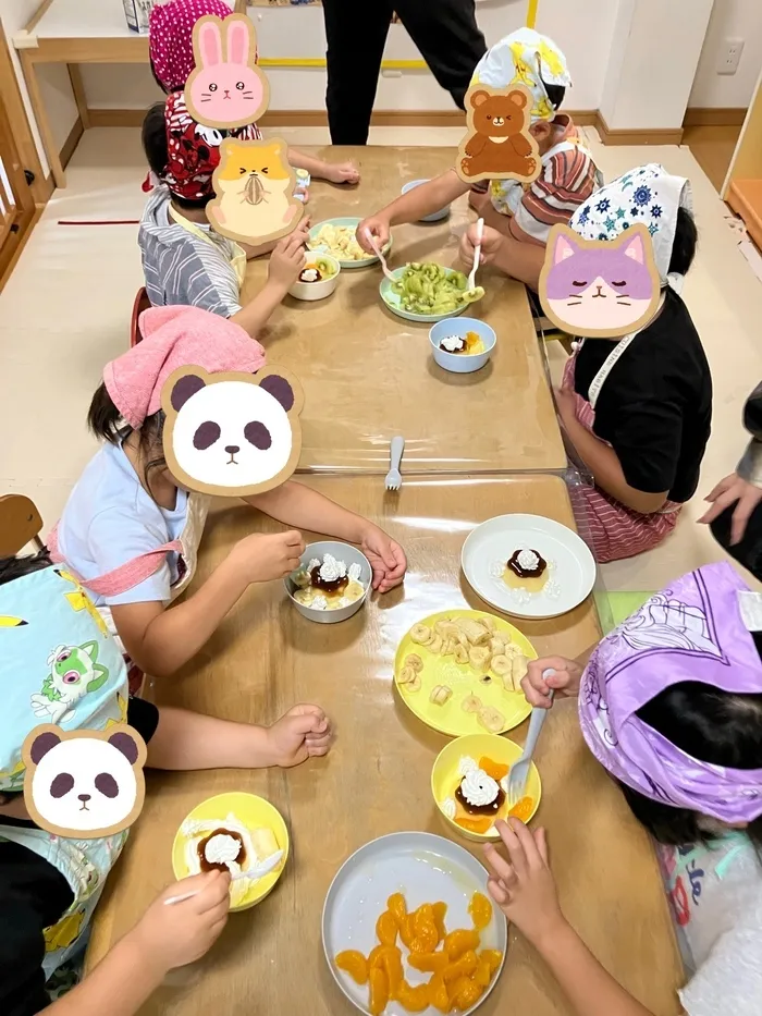 自分で切ったフルーツなどをいろんな工夫をして盛り付けすることで、一人一人オリジナリティのあるプリンアラモードが出来上がりました💕🍮