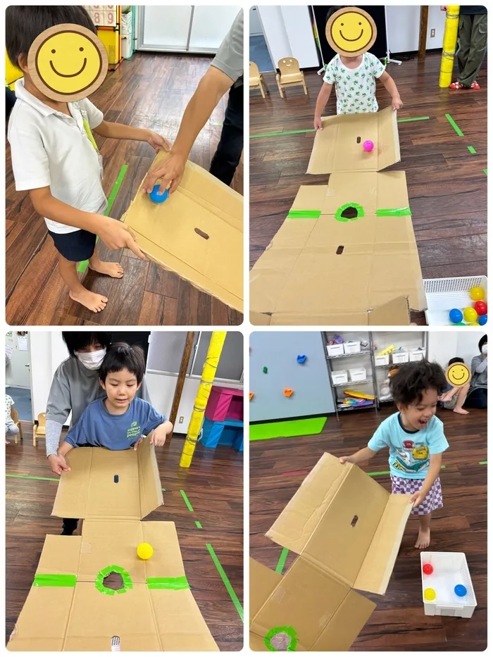 バランスを取ることが少し難しく、横からボールが落ちてしまう場面も見られましたが、何度も挑戦するうちにボールを真ん中まで転がして、、、見事入れることが出来ました🤩🌟