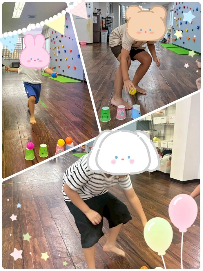 「できた😆」と喜ぶ姿や速く走りすぎてしまい紙コップの前で止まれず