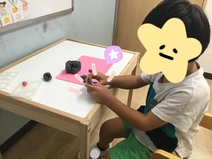 こちらの写真のお子さまは、指の分離、指先に力を加える練習をするために、粘土遊びを取り入れました!