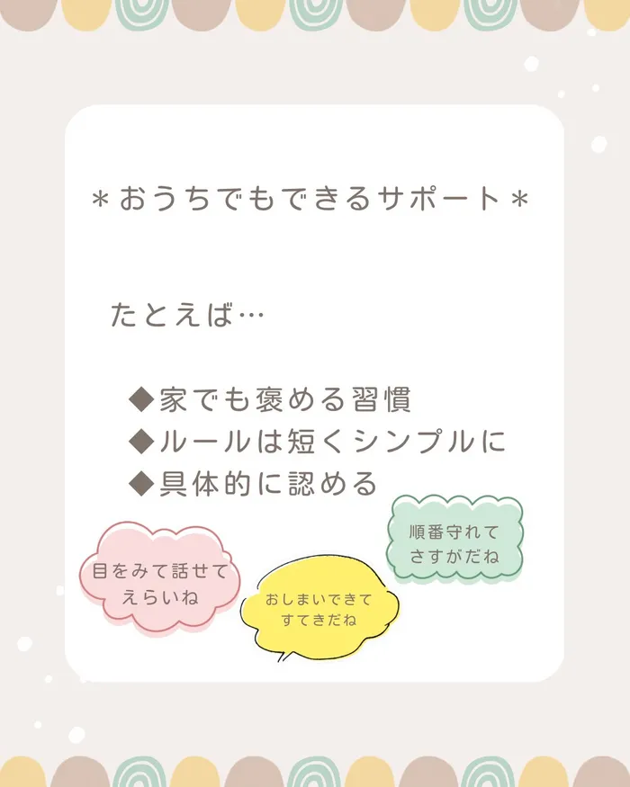 日々の育児の中で、常に意識して見ることはなかなか難しいと思うので、保護者の方がほんのちょっと気持ちに余裕がもてる時にでも 褒めポイントを探してみてくださいね♪