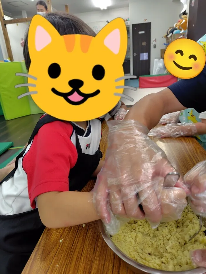コネコネした生地を手で丸める作業でやっと芋餅がどのようなものか想像でき、くるくる丸めるのに苦戦しながらも綺麗な形が出来上がると「見てみて!」と嬉しそうな様子で声をかけてくれました😁