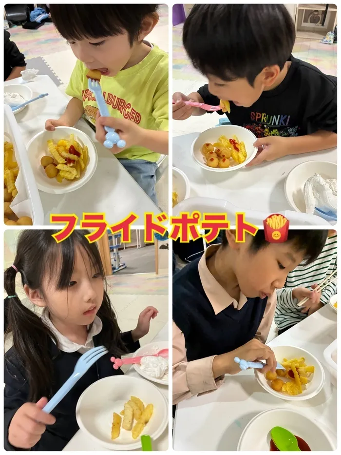 出来立てのフライドポテトにケチャップやマヨネーズ、ピザソース、さらにはホイップクリームといった変わり種まで、各々好きなように味変をしていき、たくさん食べていました🥣
