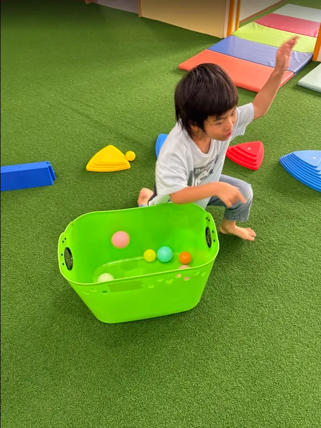 部屋中にたくさんの色のボールをちりばめ箱を押しながらボールを集めるトレーニングです。