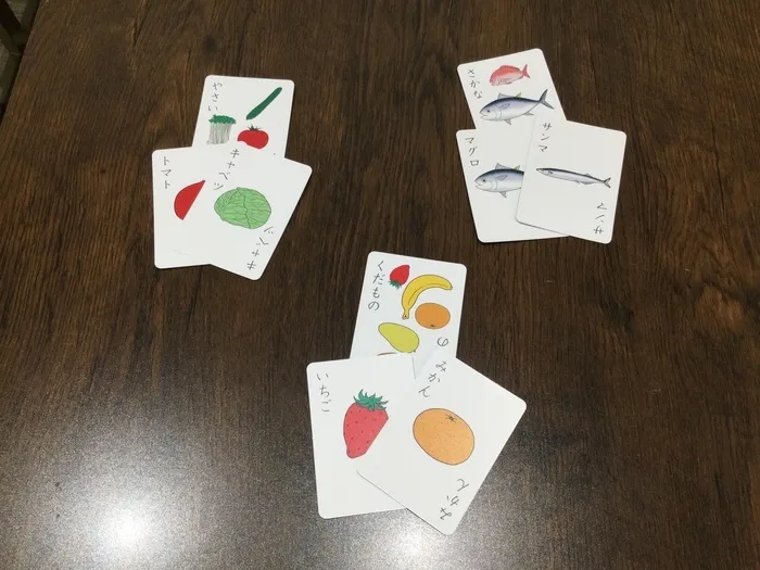 食べ物カードの「野菜」「果物」「魚」の3つの仲間に分類することを取り組んでいます。