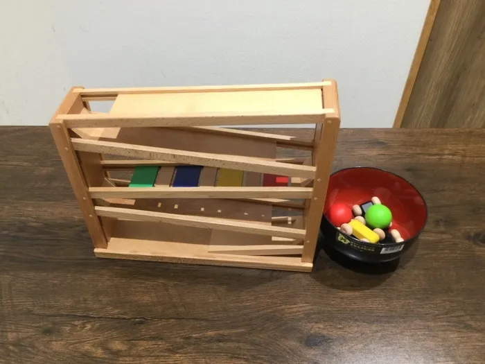 左上(始点)から右下(終点)に向かって傾斜がついている台にボールや車を置き、転がっていく様子を、左右に眼球を動かしながら追いかけることにより、上記の獲得を促していきますよ✨