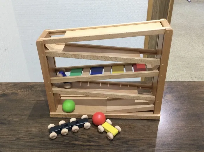 スロープトイは、コースの1番高い位置に色や形の異なるものを置いて転がす知育玩具です🚙