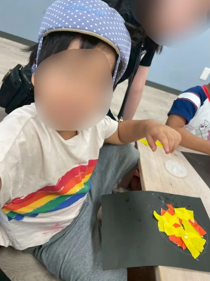 貼り方のコツとして、外周から貼ると良いことを伝えると、はみ出さずに綺麗にお月様を仕上げることができました👏