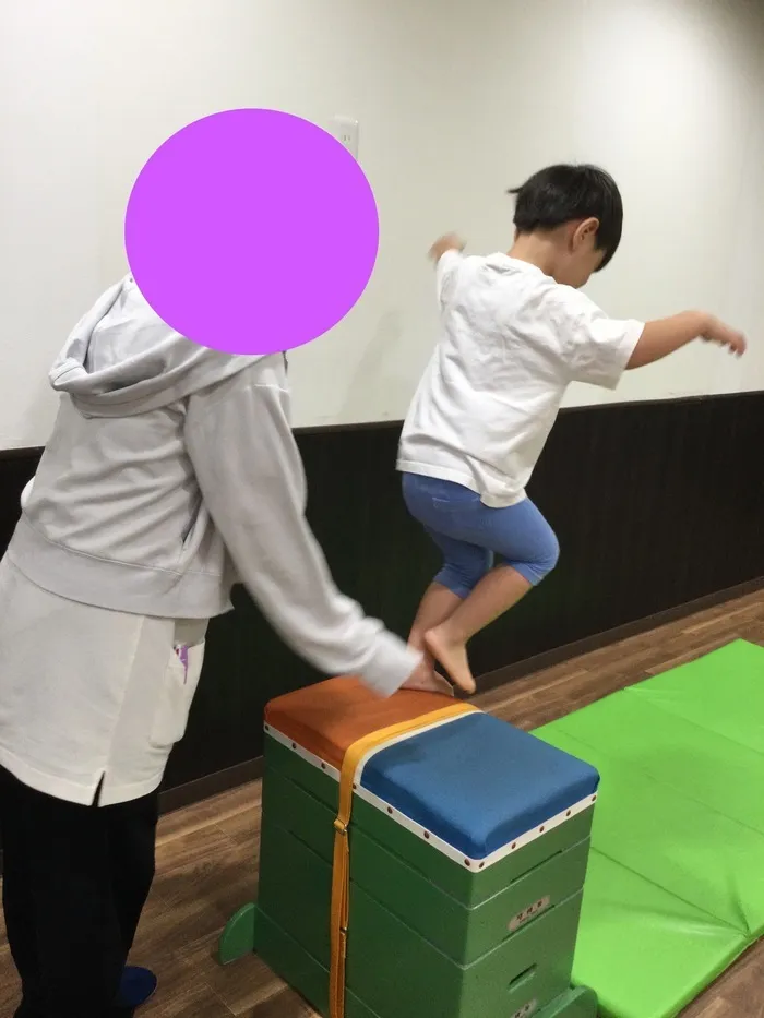 高い巧技台に登り、しっかり姿勢を整えたあと、低い所へジャンプ!「3、2、1!」の掛け声で元気に跳ぶことが出来ました!