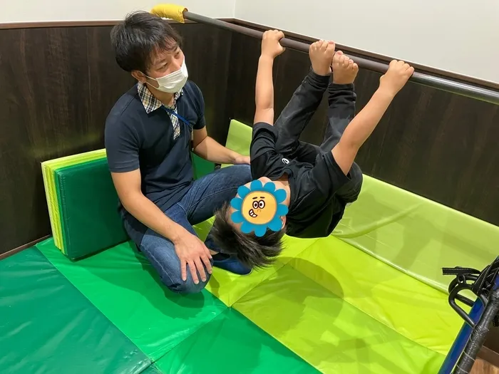 足付けぶら下がりに挑戦している年中の男の子👦🏻