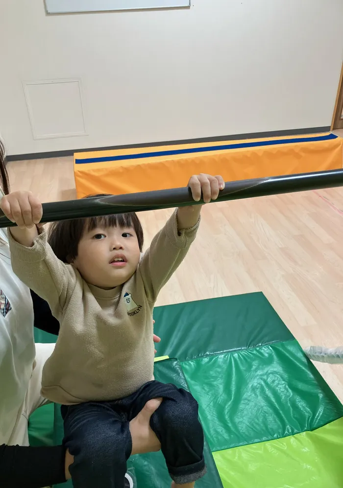 職員の手は添えられていますが、腕に力を入れてぶら下がっています。素晴らしいです♡