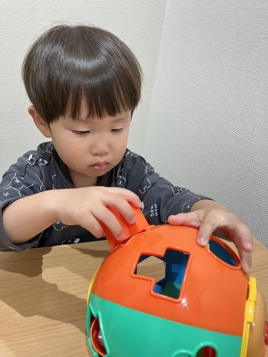 型はめパズルでは、4種類の色と様々な形のブロックがあります。写真のお子様もブロックの色を見て、どこのエリアのブロックなのかを考えながら、型にはめていっています👏