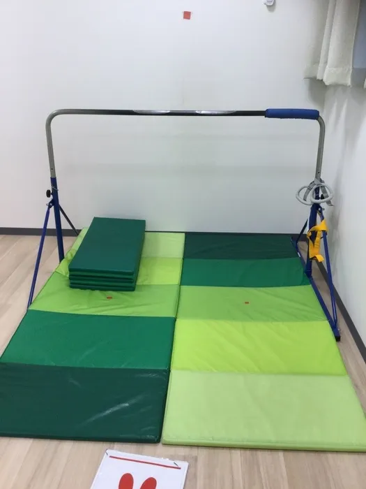 鉄棒の下に敷いたマットは「落ちても大丈夫なように」、赤い目印は「ここを見てね」の印です。