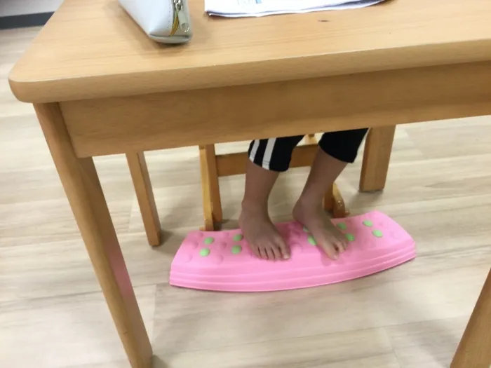 また、少し身体に触れる感覚や踏む感覚が欲しくて、足や姿勢を動かすような時に、この足台があるとその上で小さく動かすだけで充足されやすく、素湯注して課題に取り組むことができます。