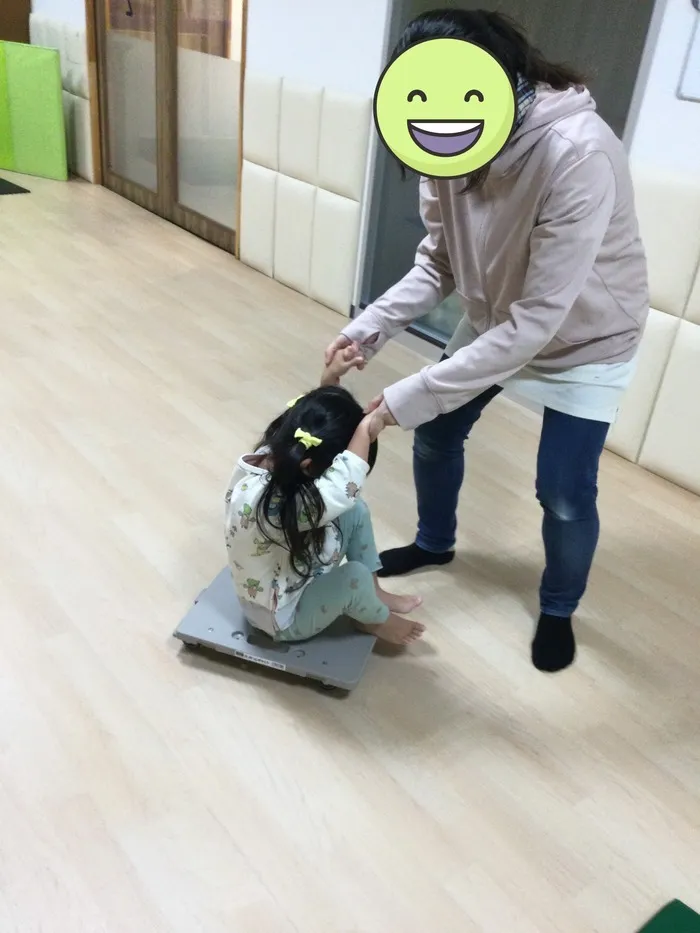姿勢の安定や力加減を学ぶために、バランスをとりながら体幹を使えるスクーターボードで筋力トレーニングを行いました!
