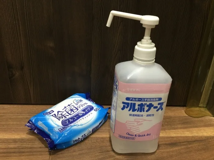 PLUSでも運動プログラムの前や教材の使用前後などで、手指の消毒を実施しています。