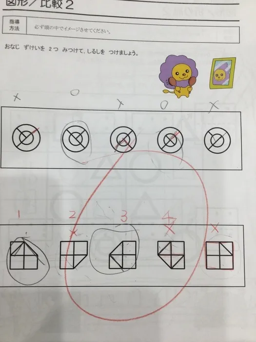 「5つの図形の中から、同じものを2つ探す」のですが、図形問題が割と得意なお兄さんなのに「うーん……?」。