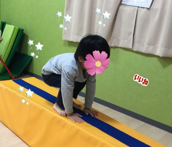 平均台の上で、手と足を順番に動かして前に進んでいきます。