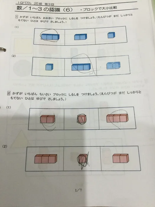 上の問題は1〜3個の中で1番大きい数のブロック、下は1番小さい数のブロックを選ぶ課題です。