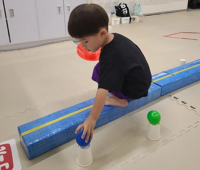 1つ目に置かれた紙コップを見落としてしまいましたが、1つ余っているのを見つけると、体の向きを変えてその場所まで戻り、ボールをゆっくりと置くAくん!平均台から落ちないように慎重にしゃがむこともできました👏