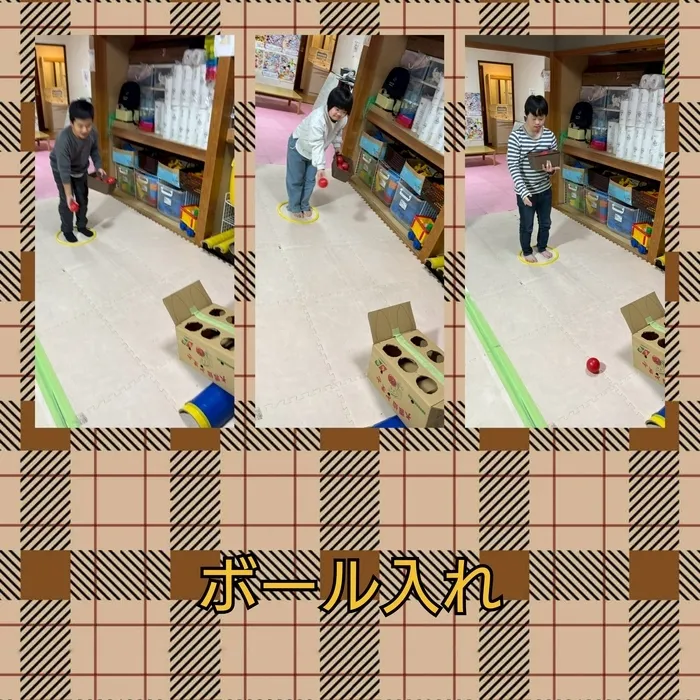 お手製の箱の中に穴を空けどれだけボールが入るかを挑戦!