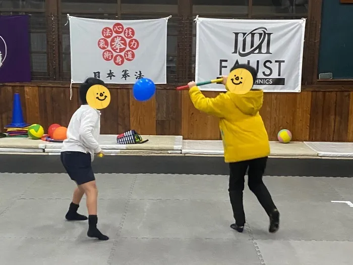 風船を棒でドリブルしたり、二人一組でパスをし合ったりなど、